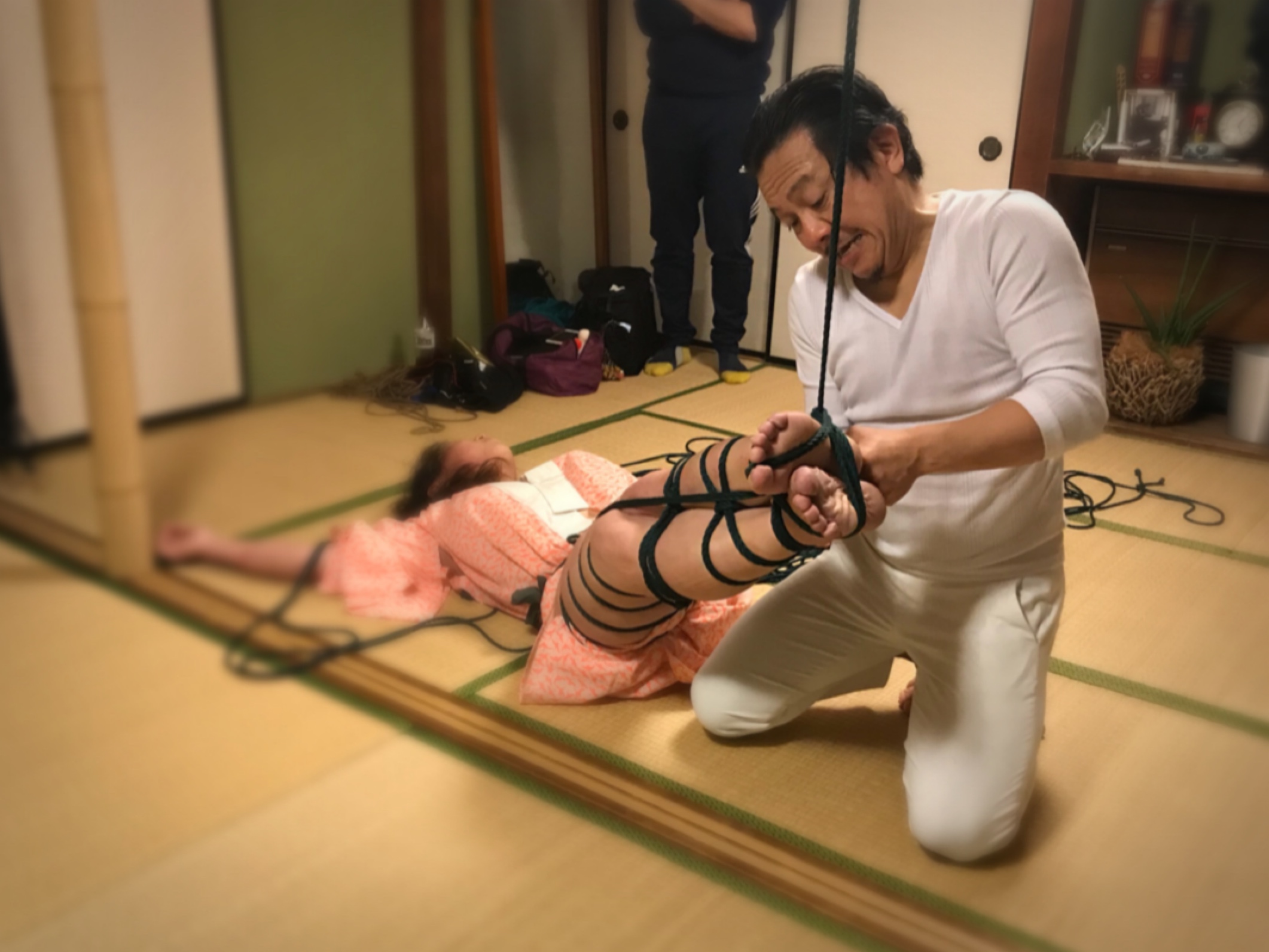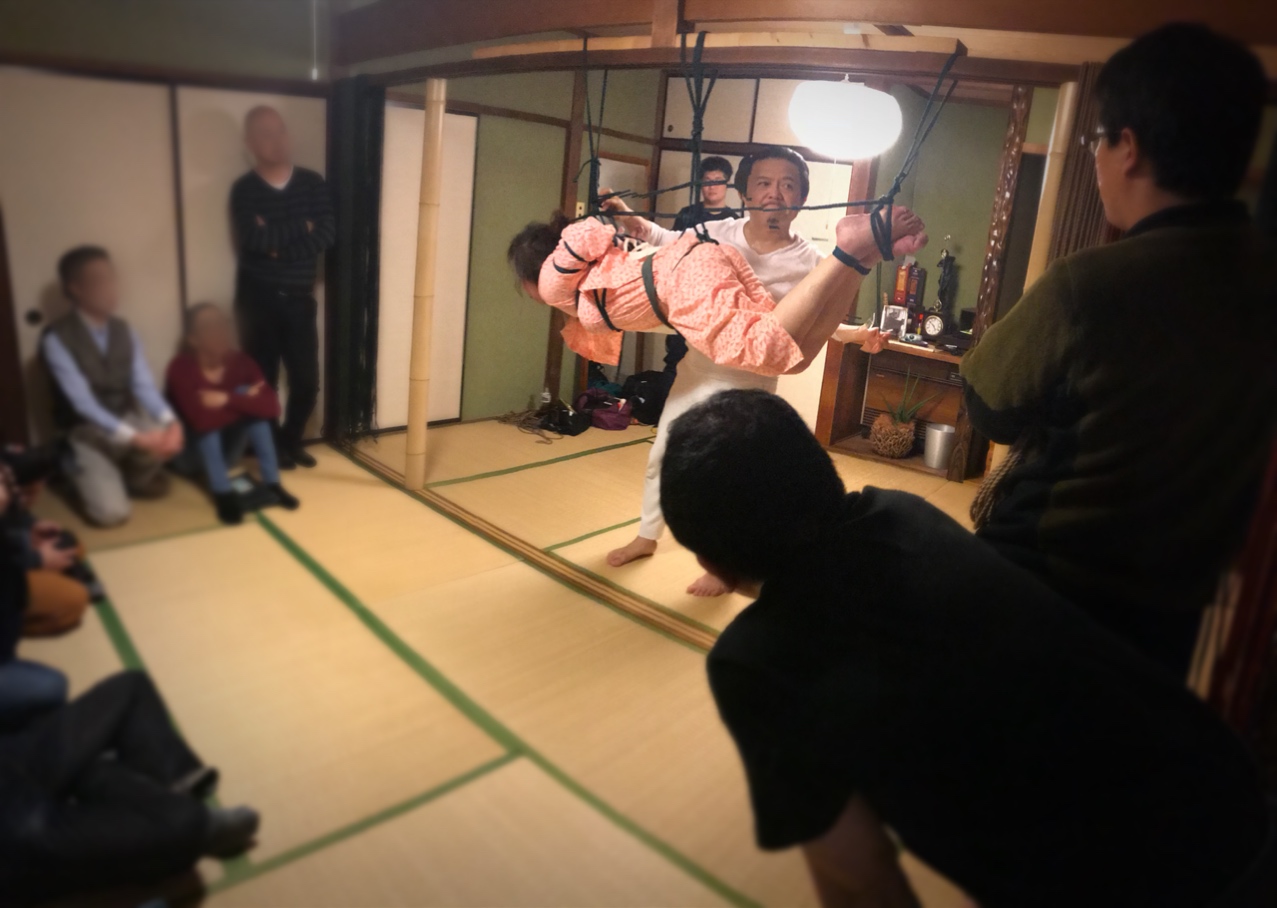 この方は、縛られて放置されるのが好きなタイプで、全身を縛り上げ、下半身を少し持ち上げる形で軽い吊りの状態でしばらく瞑想状態になっていました。