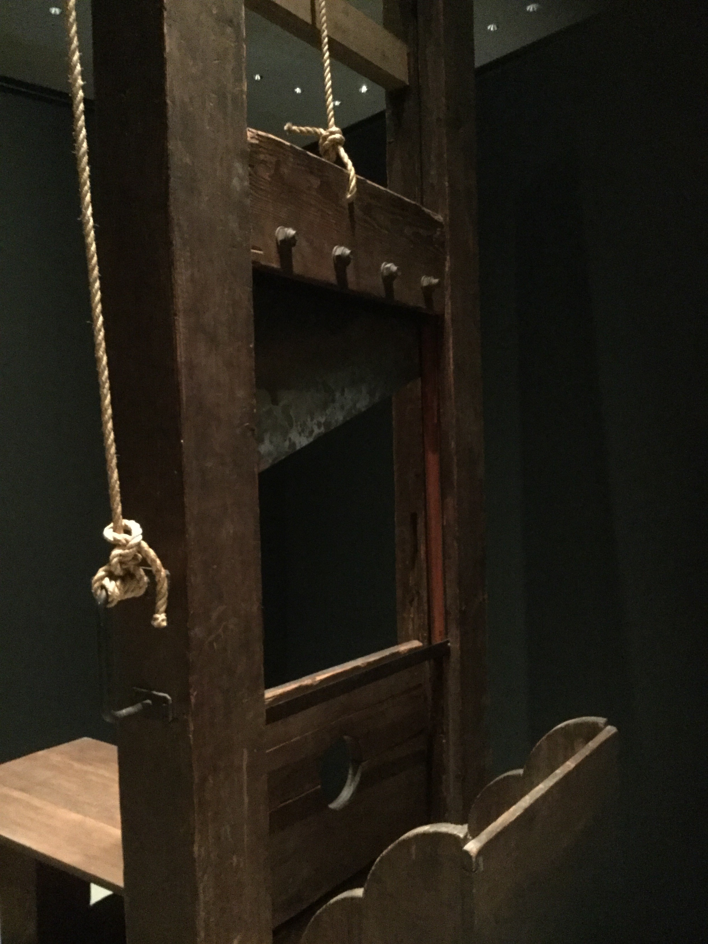 これね、ギロチンです。下の板の穴から頭を出して、真ん中の刃がストンと落ちてくる。ロマン。ではない。
